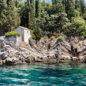 Continuing further up the most beautiful coastline of the island we ascend on to one of Corfu’s hidden treasures. The small chapel of St Arsenios is perched on the rocks, with some hidden caves and the clearest of waters, making it ideal perhaps for the first dip of the day, where you can make the most of the snorkeling equipment to explore the world beneath us, or enjoy some refreshments on board in this private spot.