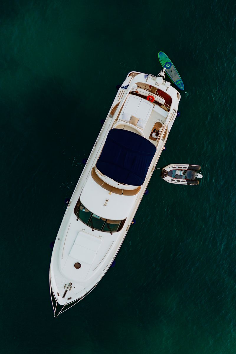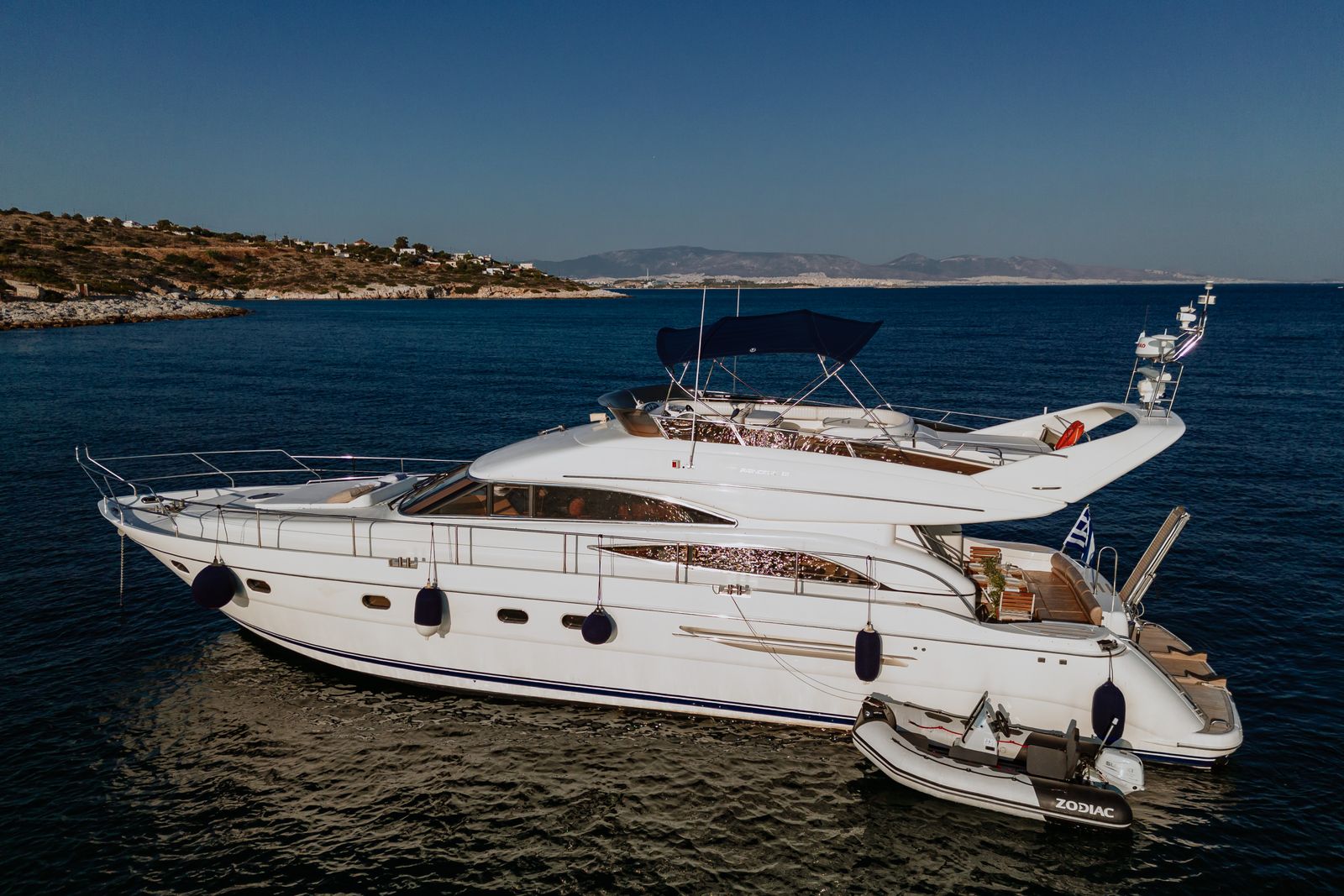 The aft deck accommodates a triple sunbed and garage for a tender or jet ski.